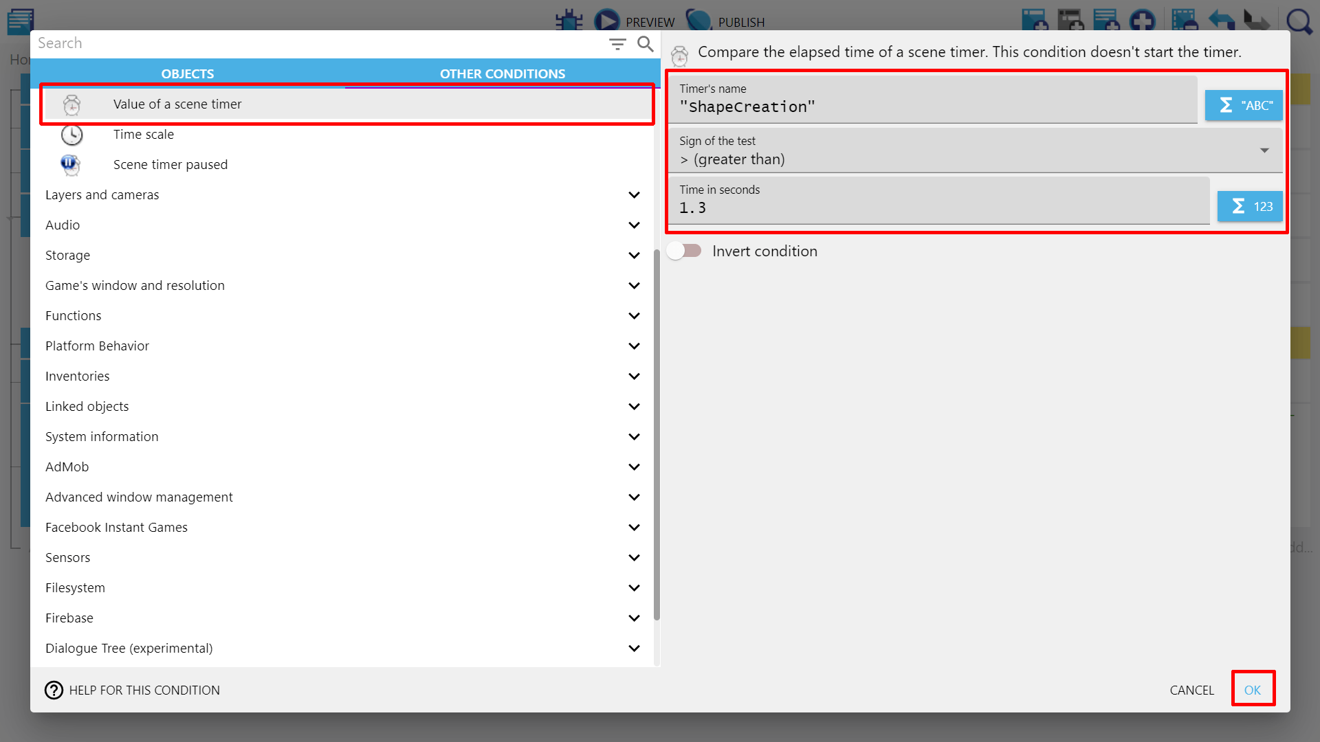 Then from the dropdown, select "Value of a scene timer" and enter two values. First is 1.3 in the "Time in seconds" field which will represent the number of seconds - every 1.3 seconds we will drop new shape onto the scene.