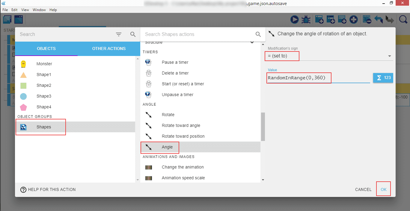 Be sure the "Shapes" are selected, then look for the "Angle" in the next panel - this will change the angle of rotation of an object. In "Modification's sign" select = (set to) and the value RandomInRange(0, 360).