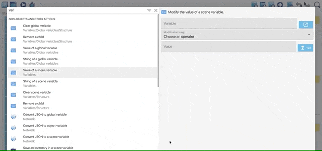 To enter the value of a variable, click the number icon next to the entered area. Afterward, choose Variables and the Value of scene variable. There will be a new window where you can select our variables.
